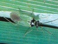 முதிர்ச்சியடைந்த தத்துப்பூச்சி 4.5-5.0 மிமீ நீளத்துடன், மஞ்சளான பழுப்பு முதல் கரும்பழுப்பு நிற உடலைக் கொண்டிருக்கும். அதன் இறக்கைகள் நிறமில்லாமல், மங்கிய மஞ்சள் நிறமாகக் காணப்படும். இரண்டு தனிச்சிறப்புடைய இறக்கை அமைப்புகளைக் கொண்டது. “நீளிறக்கைகள்” மற்றும் “சிற்றிறக்கைகள்” (இறக்கை வெளிப்புற அமைப்பு பல காரணிகளால் துாண்டப்படுகின்றது. அதாவது, இளம் உயிரிப் பருவத்தில் கூட்டமாகவும், உணவின் அளவு மற்றும் தரம் குறைந்தும், குறுகிய நாள் அளவு, மற்றும் குறைந்த வெப்பநிலை ஆகியவை முதிர்ச்சி நிலையை மேம்படுத்துகின்றன). |
